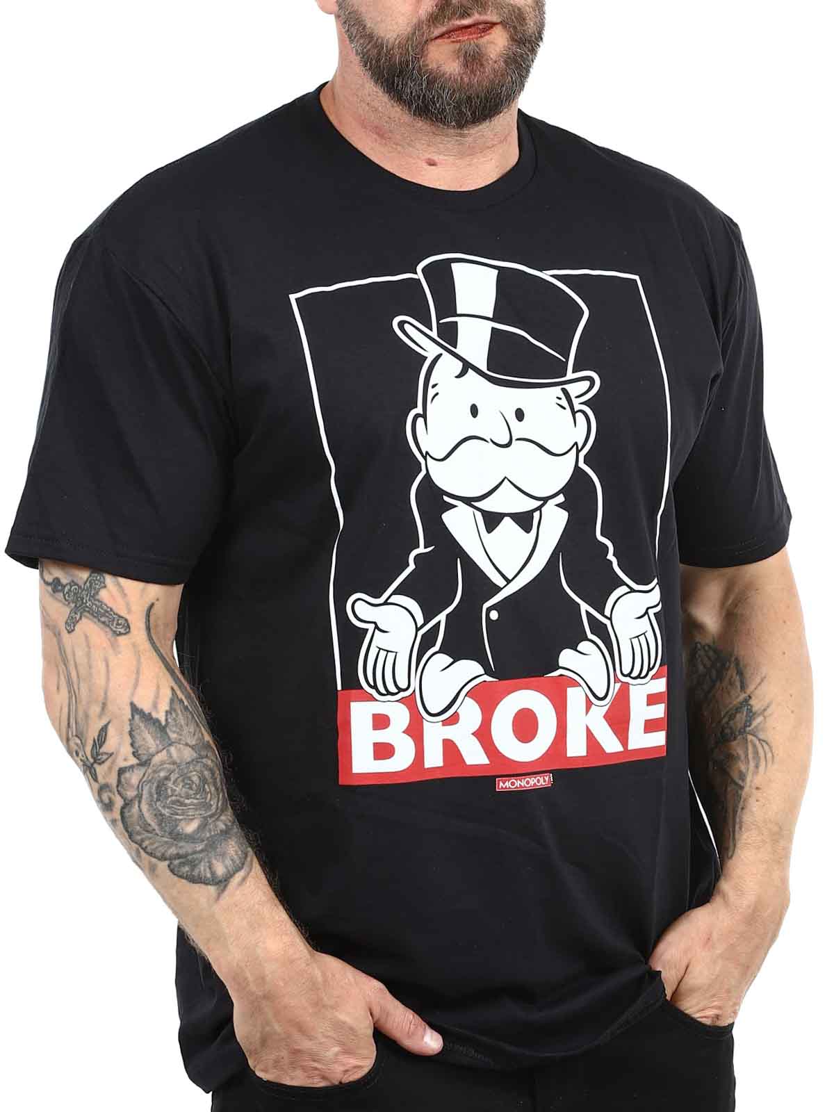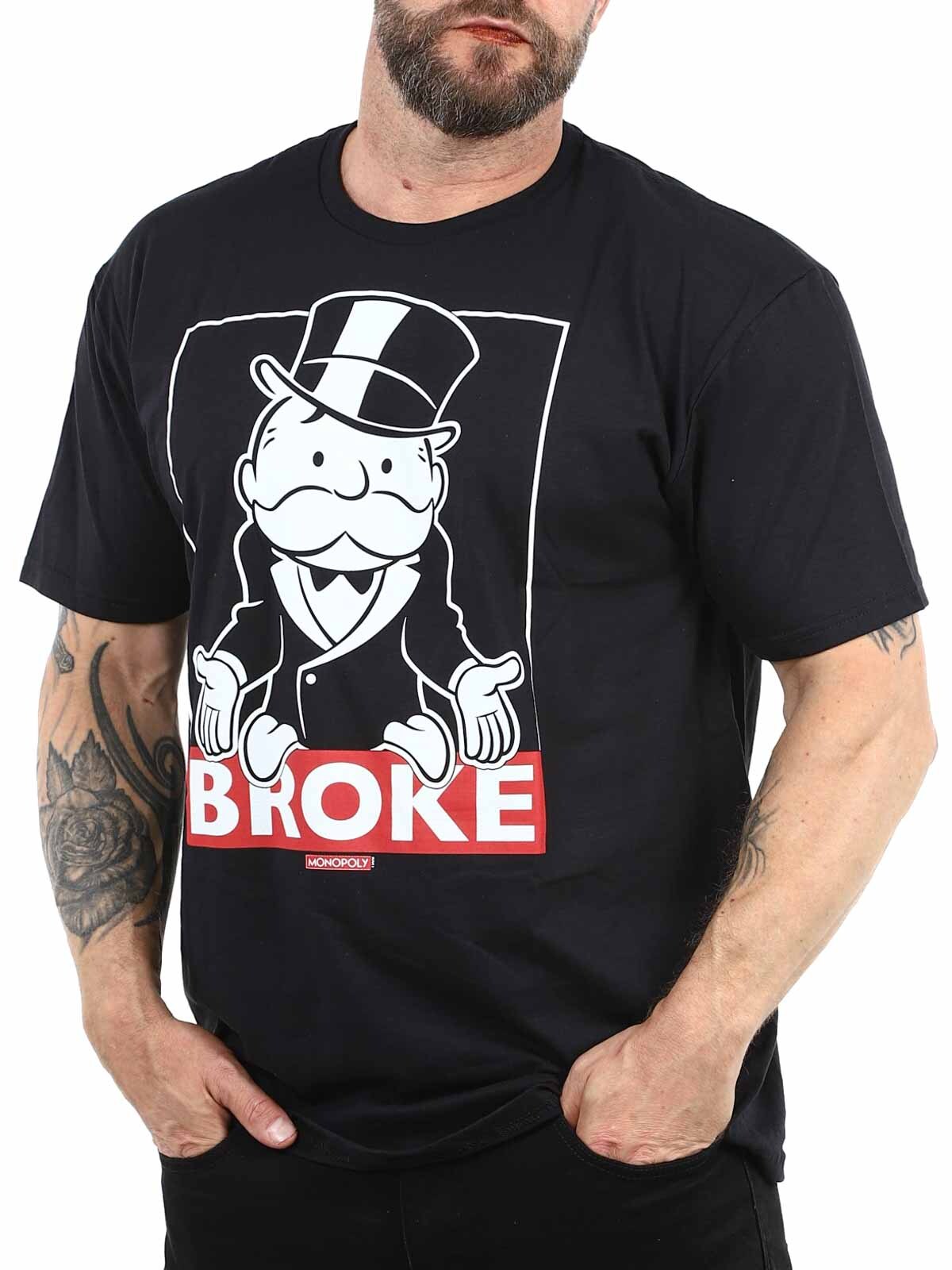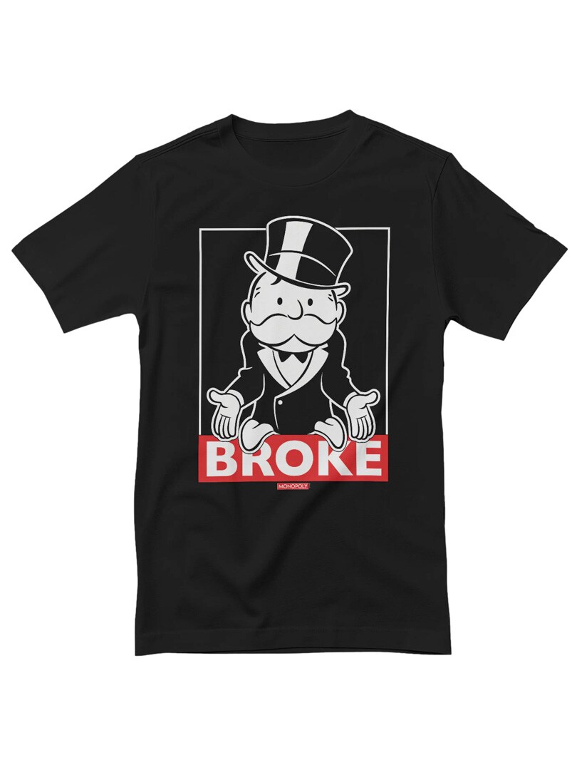 Black t-shirt featuring Mr. Monopoly in his classic “bankrupt” pose. With the text “BROKE”, it offers smart and self-deprecating humor. A perfect garment for both board game fans and those with a sharp sense of sarcasm.