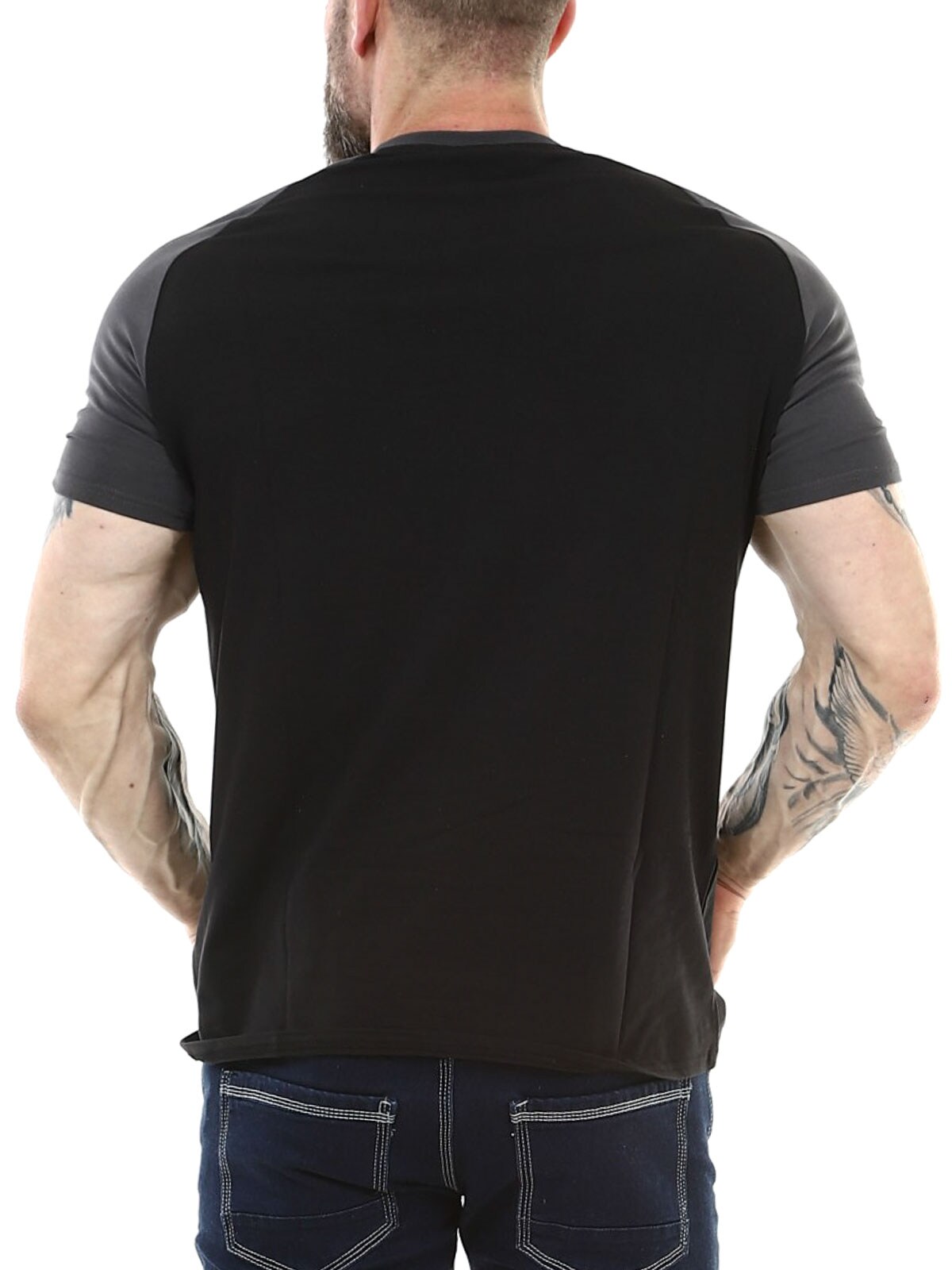 Stylish black T-shirt with dark grey sleeves and a white embroidered logo on the chest. A perfect garment for those who want to combine comfort, a sporty feel, and modern design. The T-shirt is made from a soft and stretchy material that follows your movements without losing its shape.
