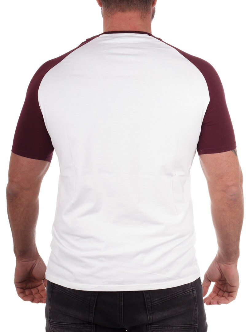 A clean and stylish white T-shirt with burgundy sleeves and a black embroidered chest logo. The perfect piece for anyone wanting to combine comfort, a sporty feel, and modern design. The T-shirt is made from a soft and stretchy material that moves with you without losing its shape.