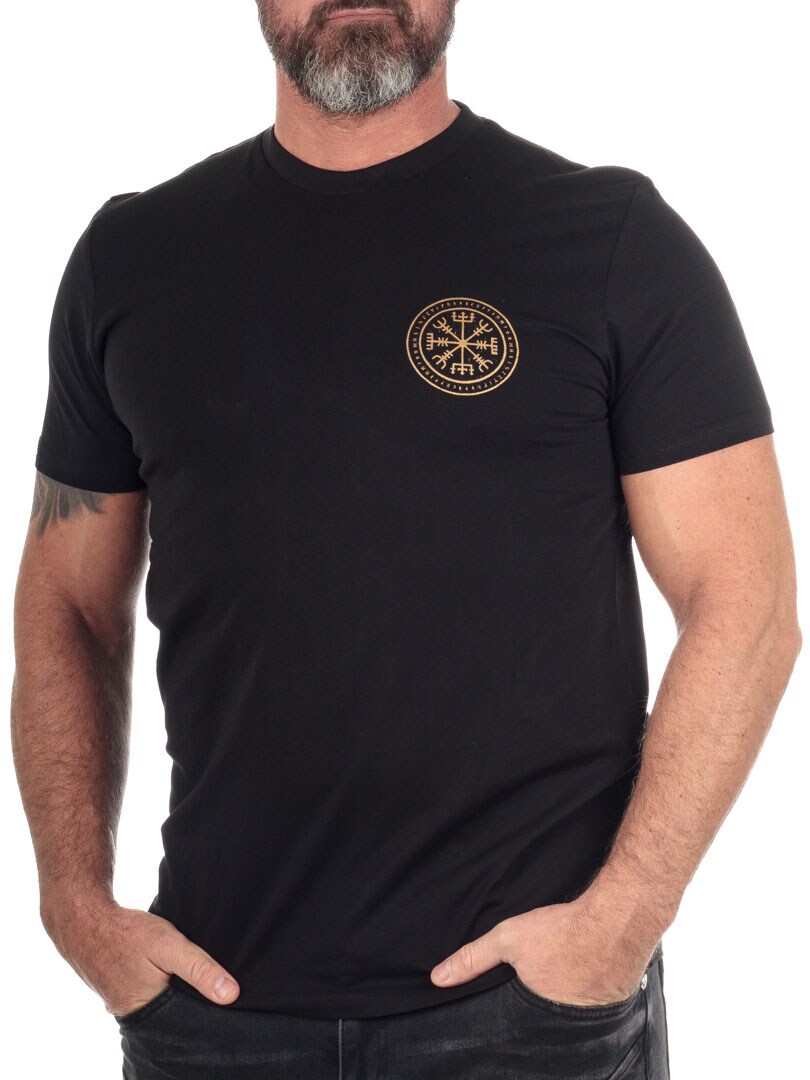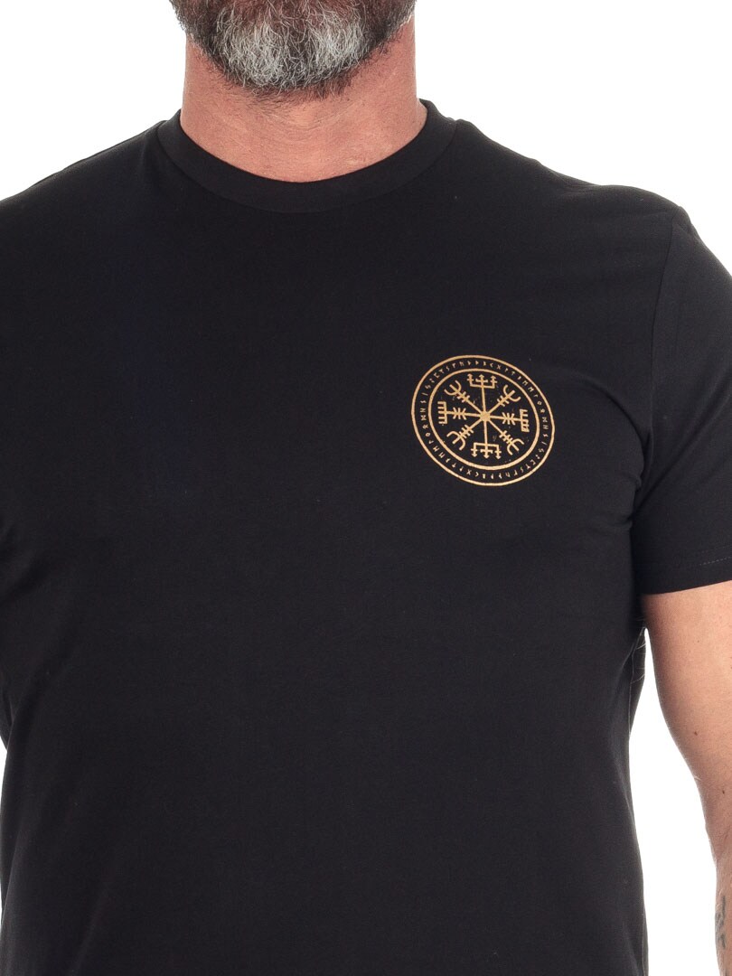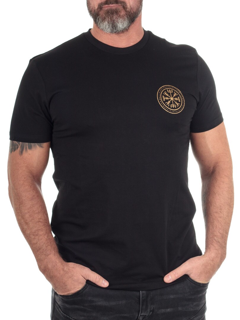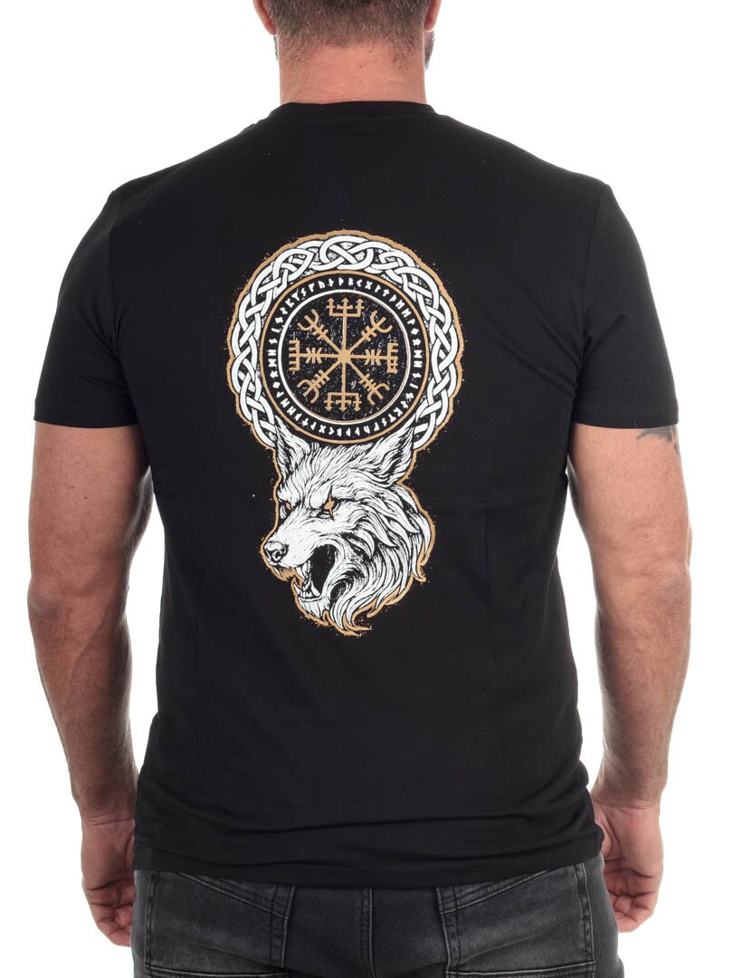This t-shirt offers a perfect balance between attitude and style with its detailed design. The back is dominated by a large, eye-catching motif depicting the Fenris wolf and a runic compass, while the chest is adorned with a smaller, gold-colored symbol for a more discreet look from the front. The t-shirt has a classic fit and a ribbed, round neckline, making it comfortable to wear. It is made of 100% cotton and is only available for purchase at RockDenim.