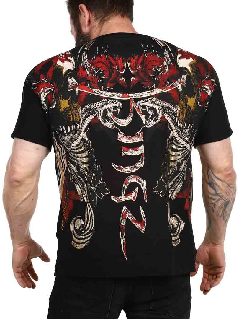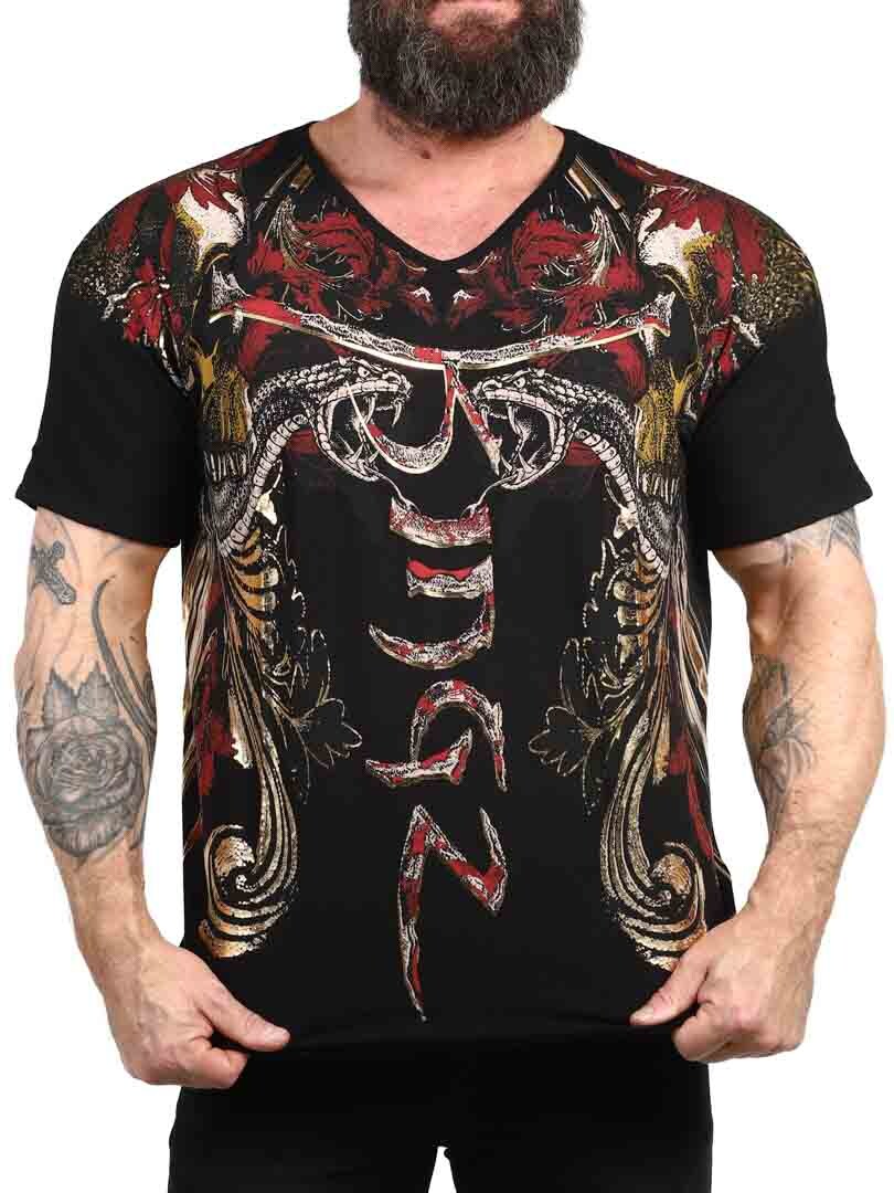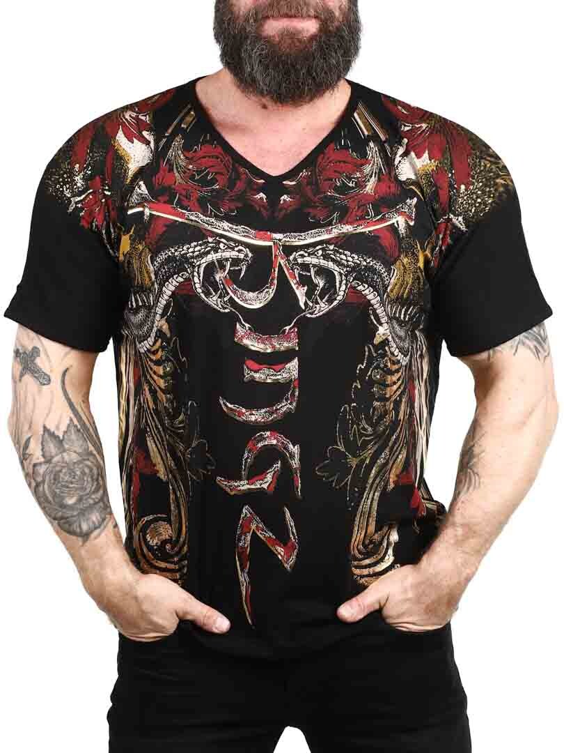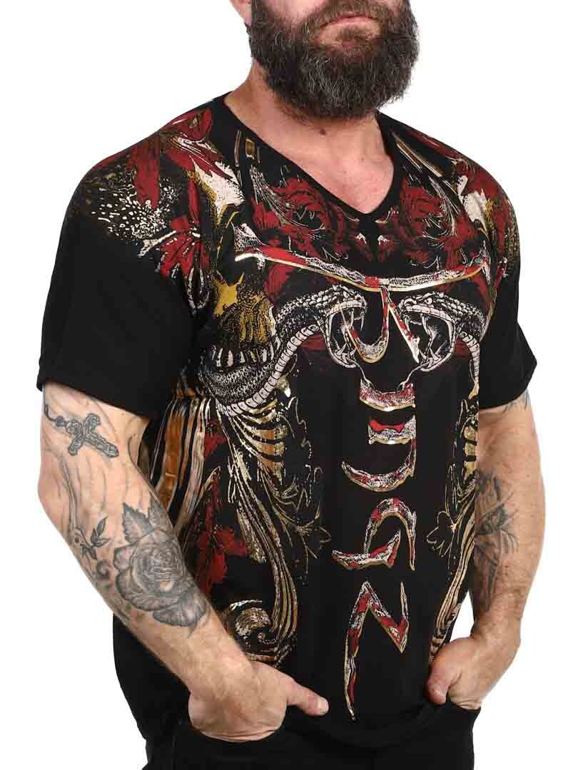 T-shirt with a bold and expressive design, perfect for those who want to make a strong impression. Featuring a detailed print that mixes skulls, snakes and dynamic patterns in red, gold and black, the shirt gives a rebellious and artistic feel. Made from stretch cotton with a v-neck opening. An obvious choice for those who want a unique look with attitude!