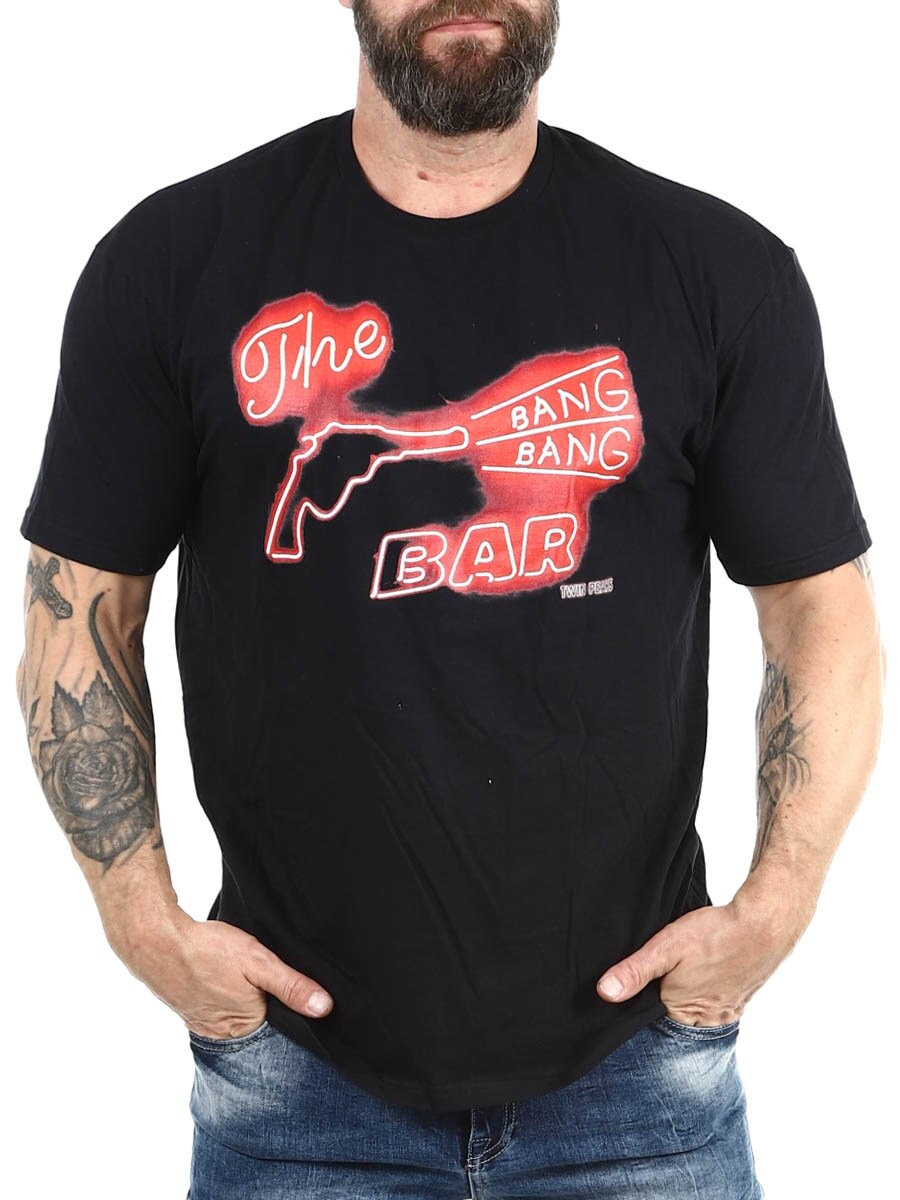 Black t-shirt featuring a retro-inspired neon print of a revolver and the text “The Bang Bang Bar.” Made from soft cotton for a comfortable fit – perfect for those who love vintage style with attitude.