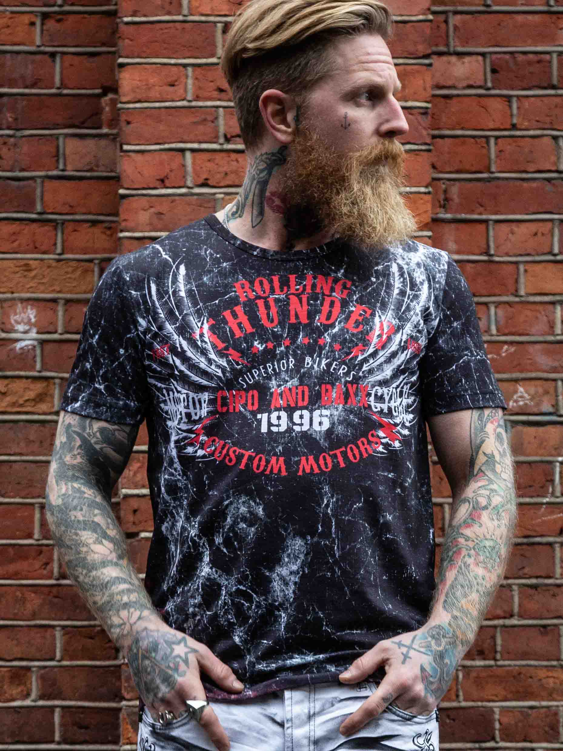 Patterned t-shirt in black, red, and white with a rounded neckline and good fit. Similar to workout material with a comfortable stretch.