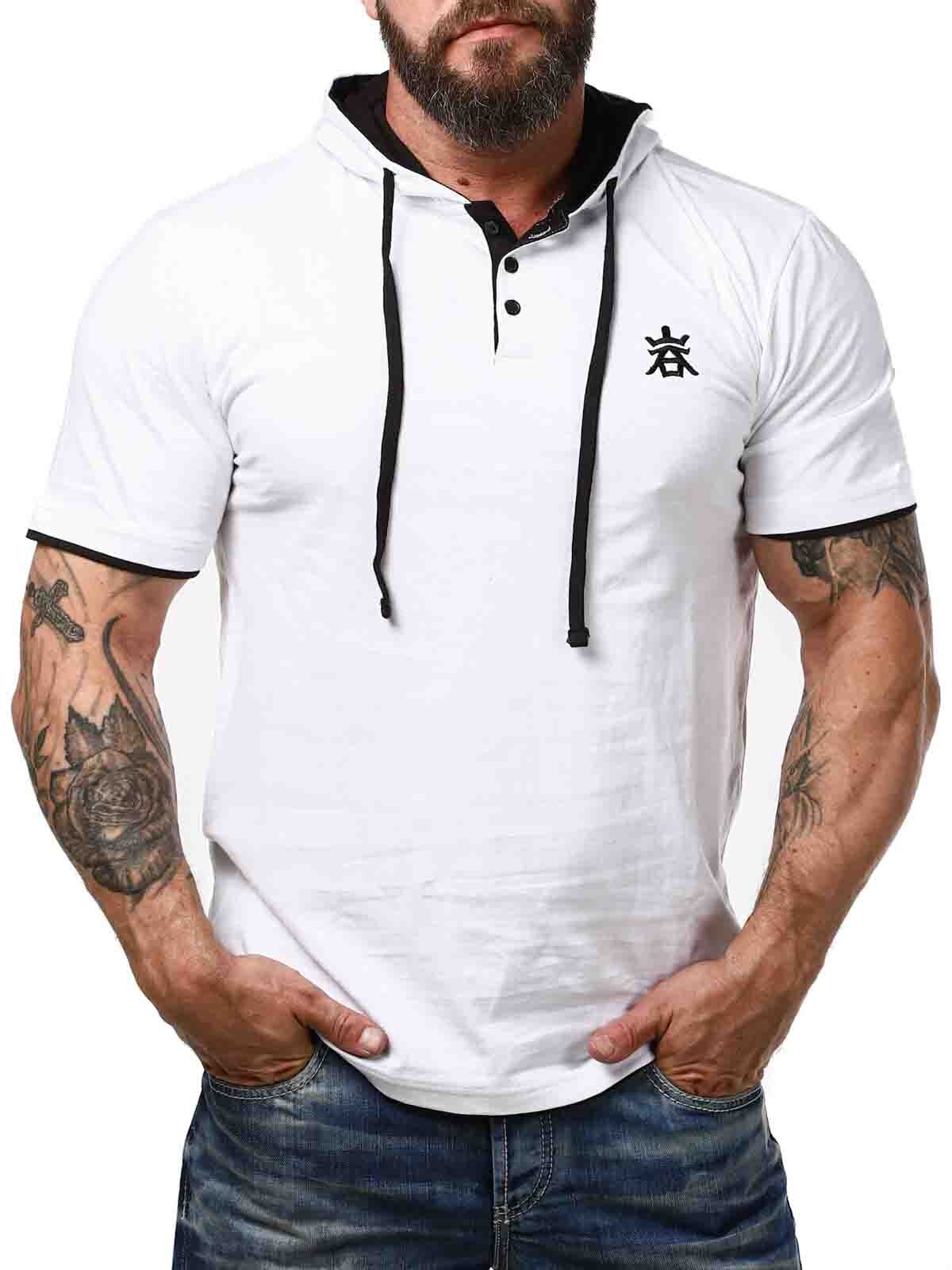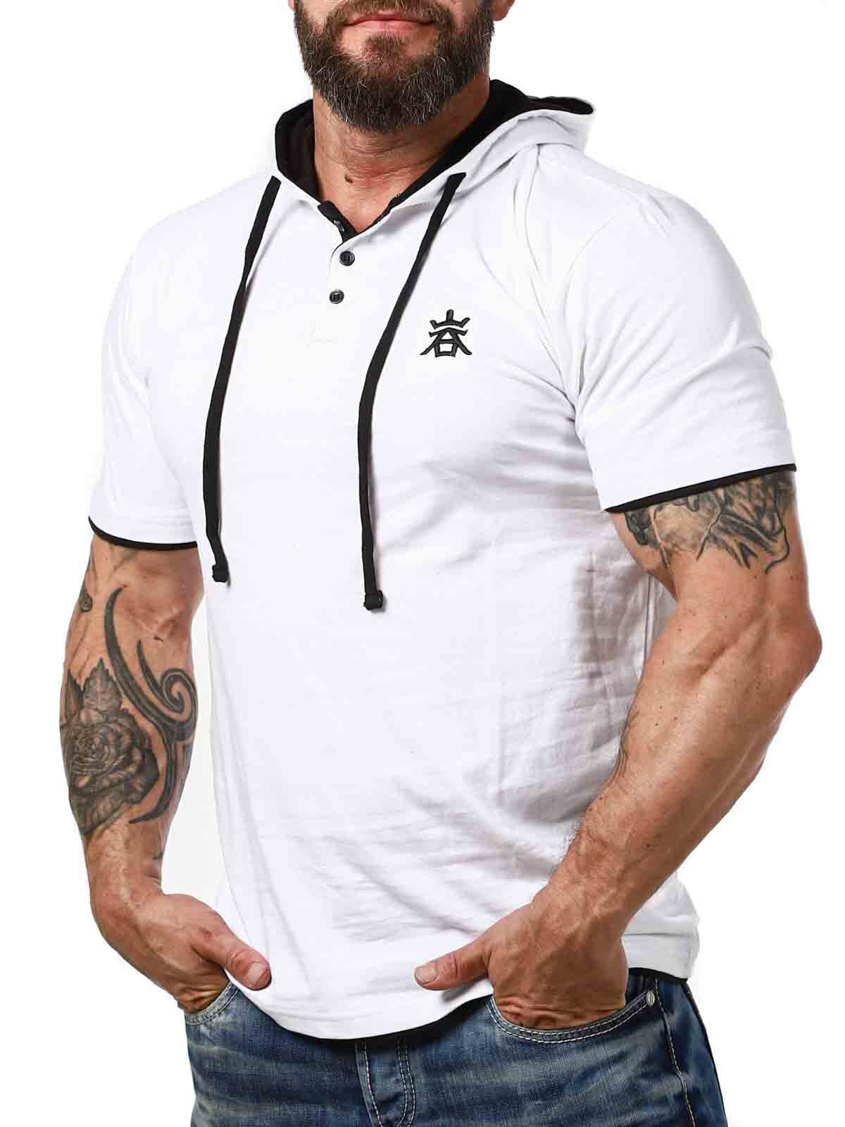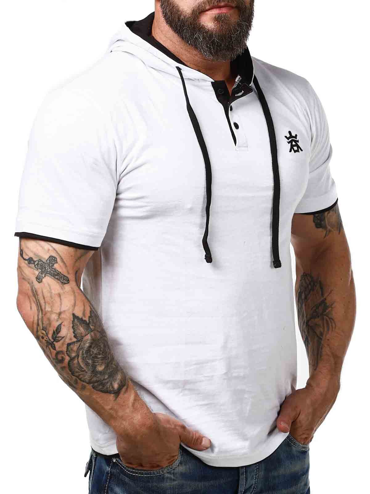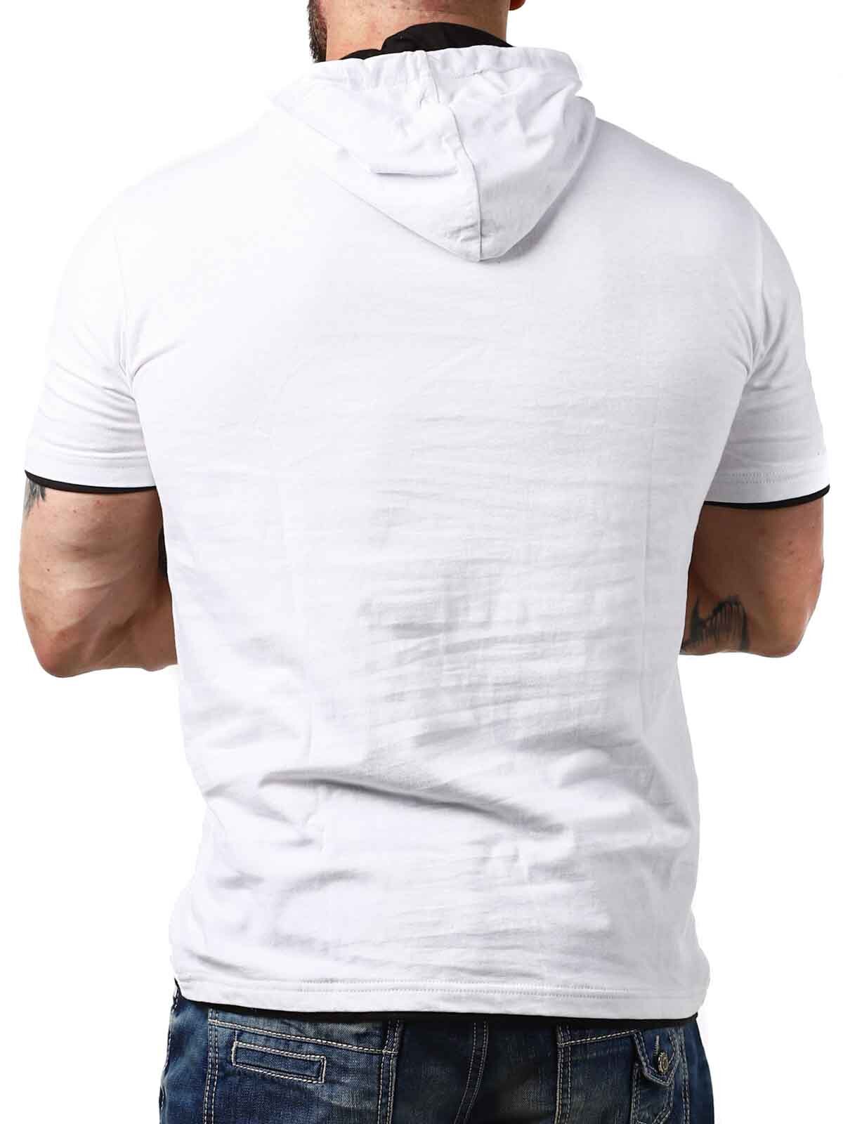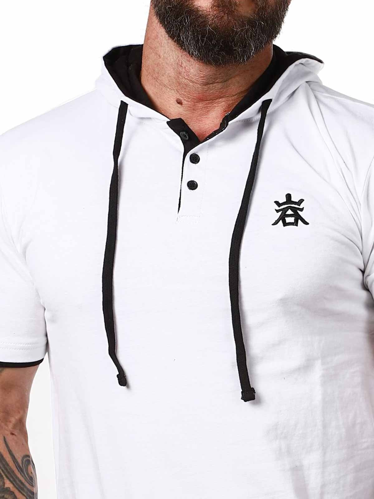 White t-shirt with black details. It features a classic fit, a hood, and a button closure at the front. This unique t-shirt is available exclusively at RockDenim!