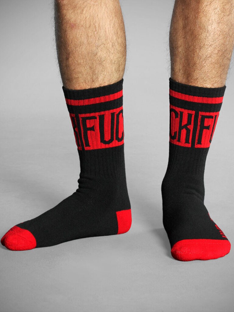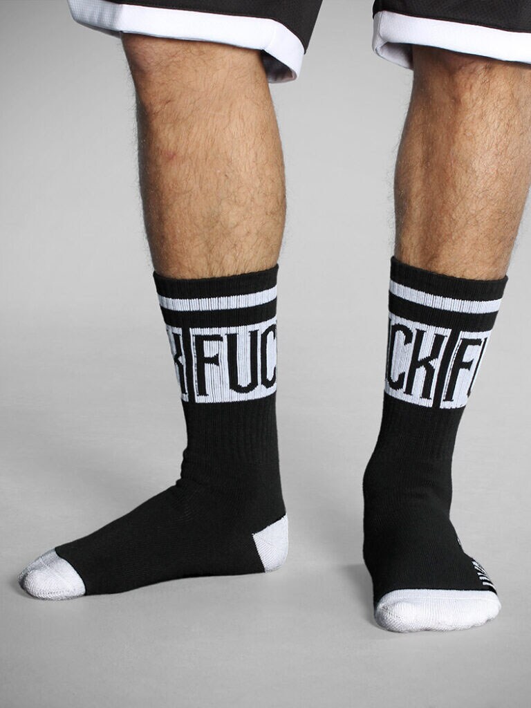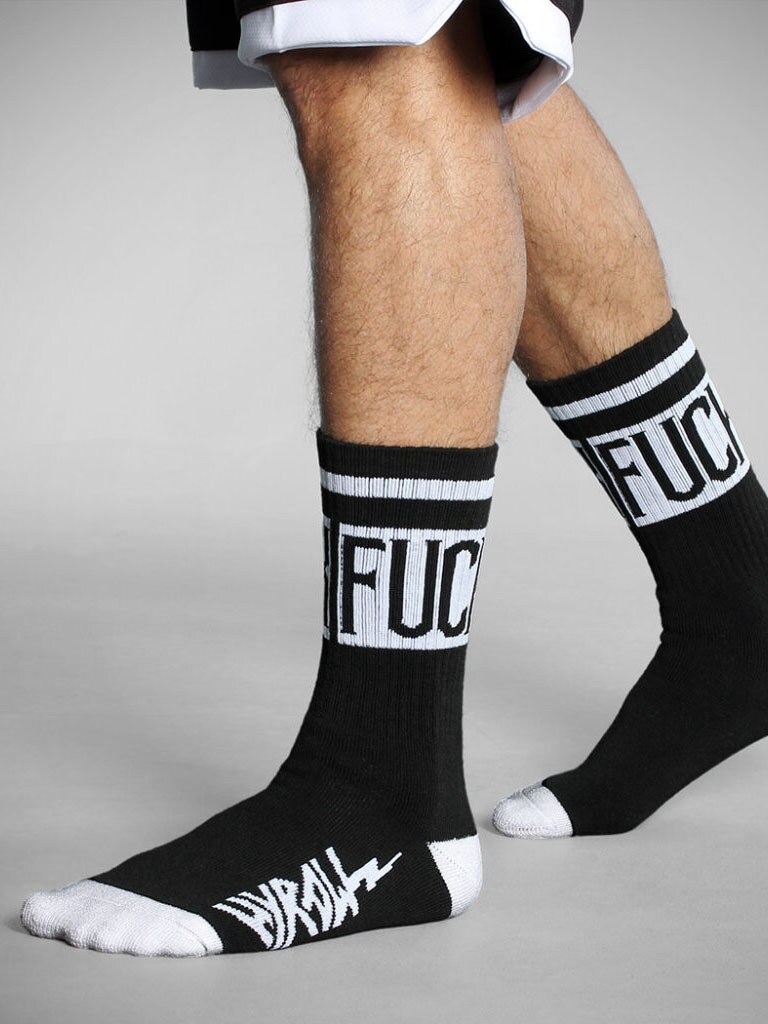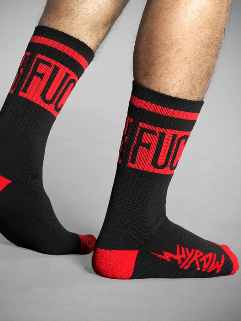 This pack contains two pairs of black socks with the bold words "FUCK" on the top and the HYRAW logo in red and white on the bottom. Perfect for those who want to put their foot down - literally.