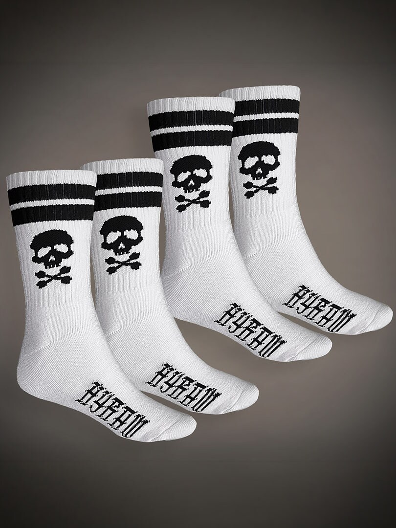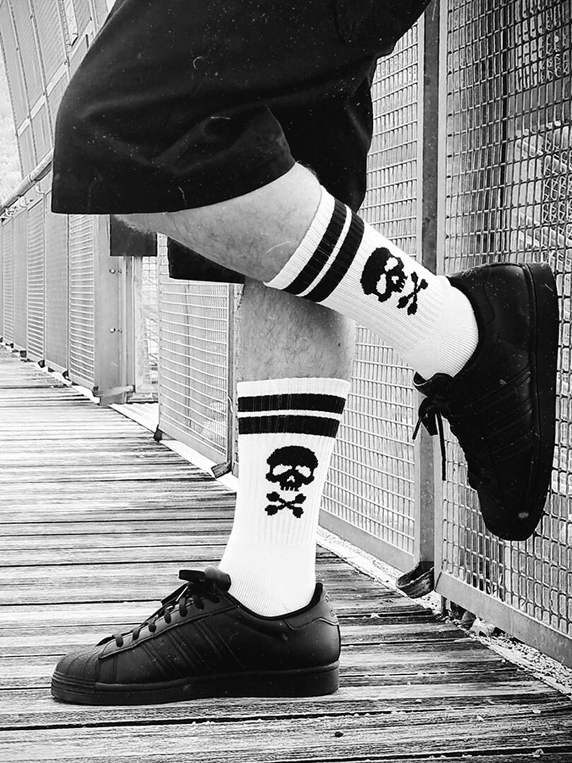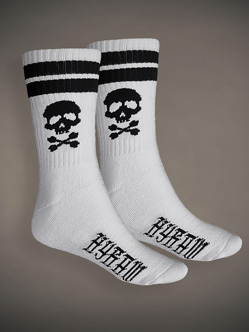 Comfortable socks with a black skull motif, logo, and stripes. Ribbed cuff at the top.
