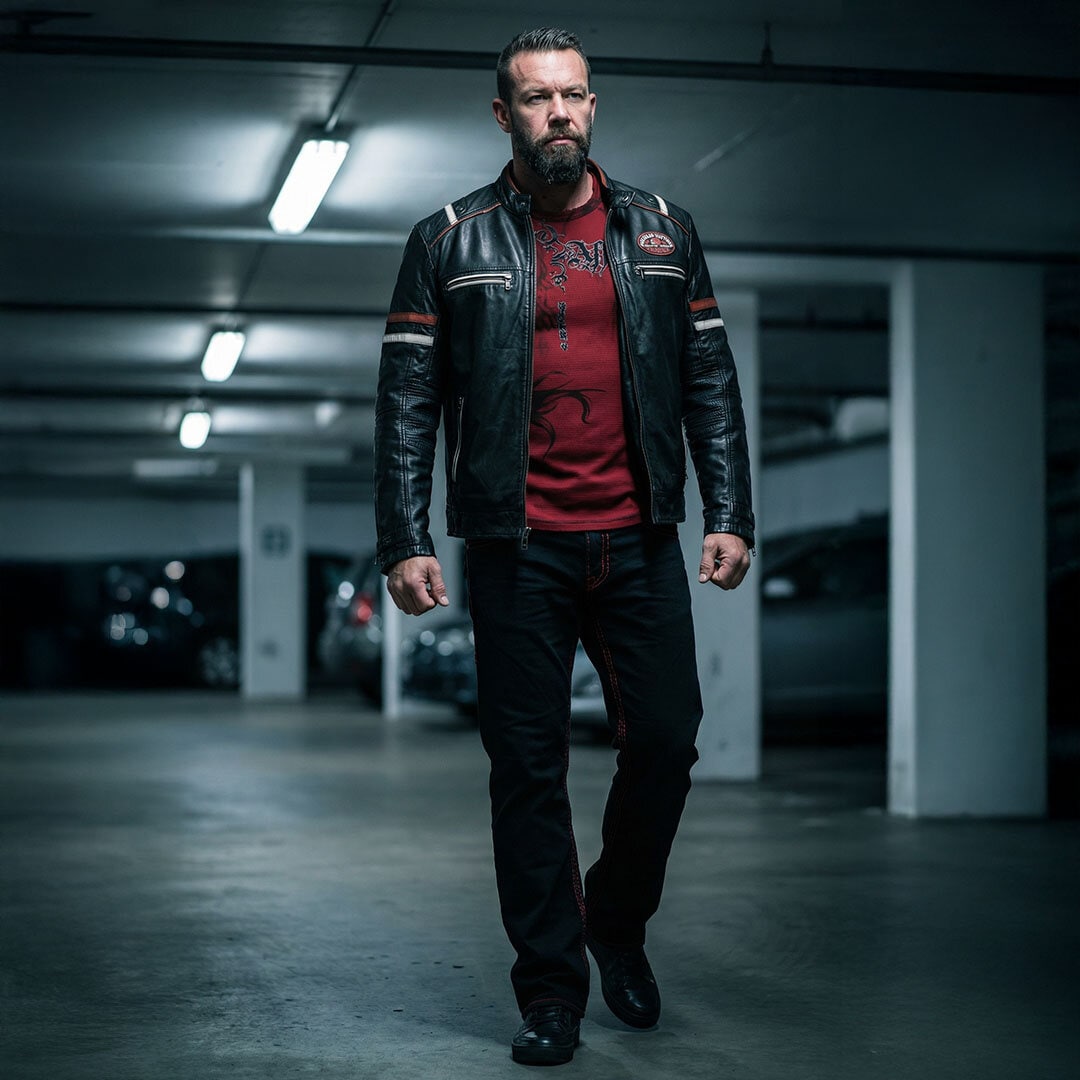 Define your edge with the Affliction Dakota Leather Jacket paired with the reversible Indian Chief Longsleeve. Complete the rugged look with Affliction Cooper Jeans featuring signature red contrast stitching for a bold, high-octane finish.